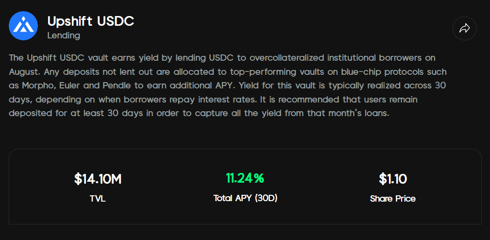 Upshift USDC vault generates returns by lending USDC to overcollateralized institutional borrowers via August, with any unlent capital deployed into secondary protocols like Morpho, Euler, and Pendle.